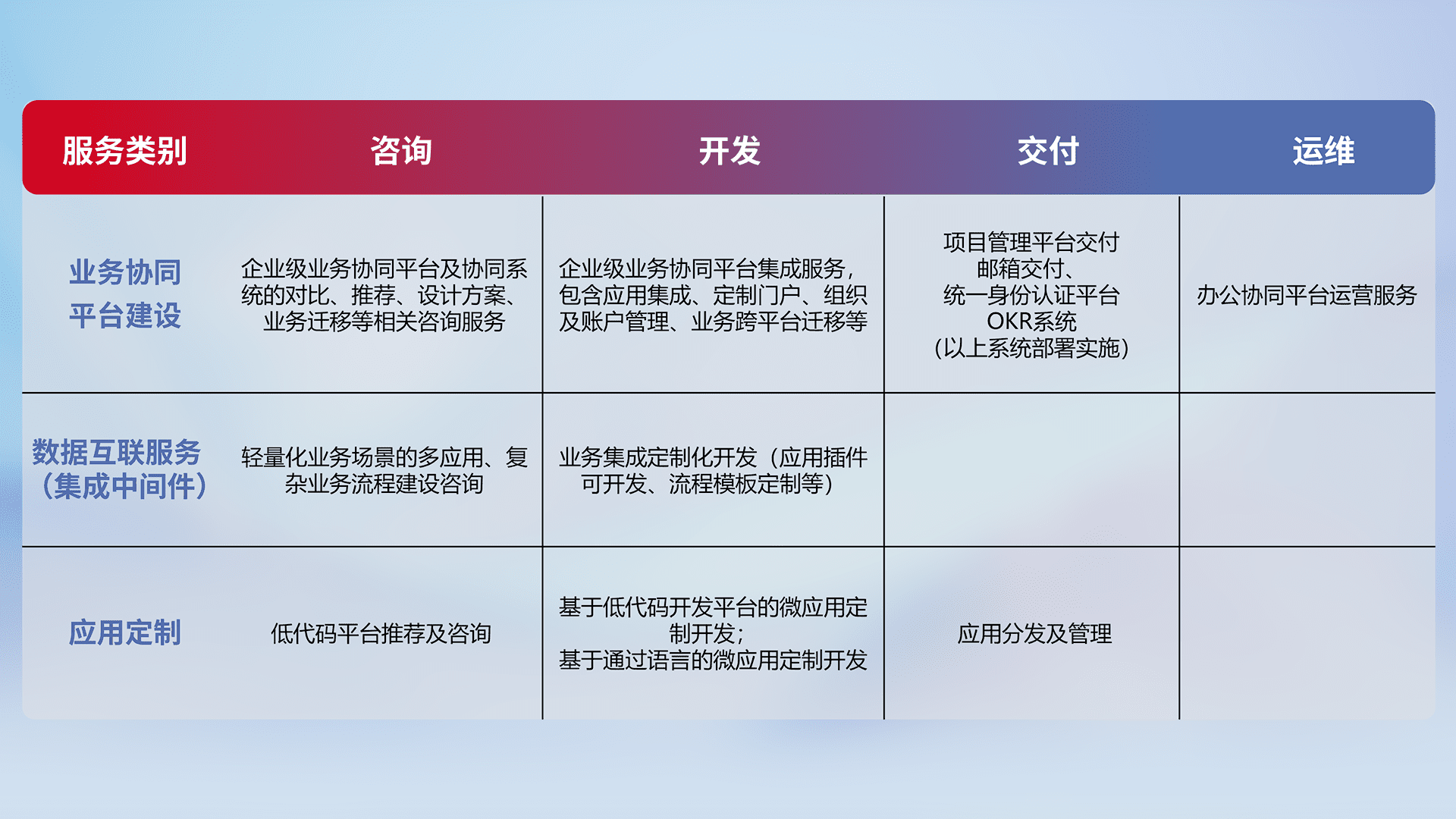 针对钉钉、、企微、、、、IDaas等平台级产品提供产品的规划、、、方案、、、交付、、定制化开发等服务,,,实现如统一协同办公、、、智能客户服务、、、、混合会议管理、、智能数据查询、、等业务场景,,,,实现数字化转型。。。
